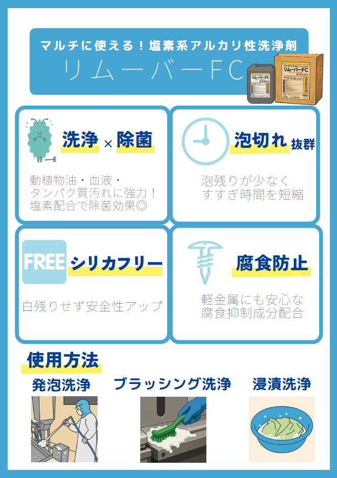 リムーバーFC(塩素化アルカリ性) は、食品業界向けに開発された高性能洗浄剤で、油脂・タンパク・色素汚れに強力にアプローチします。